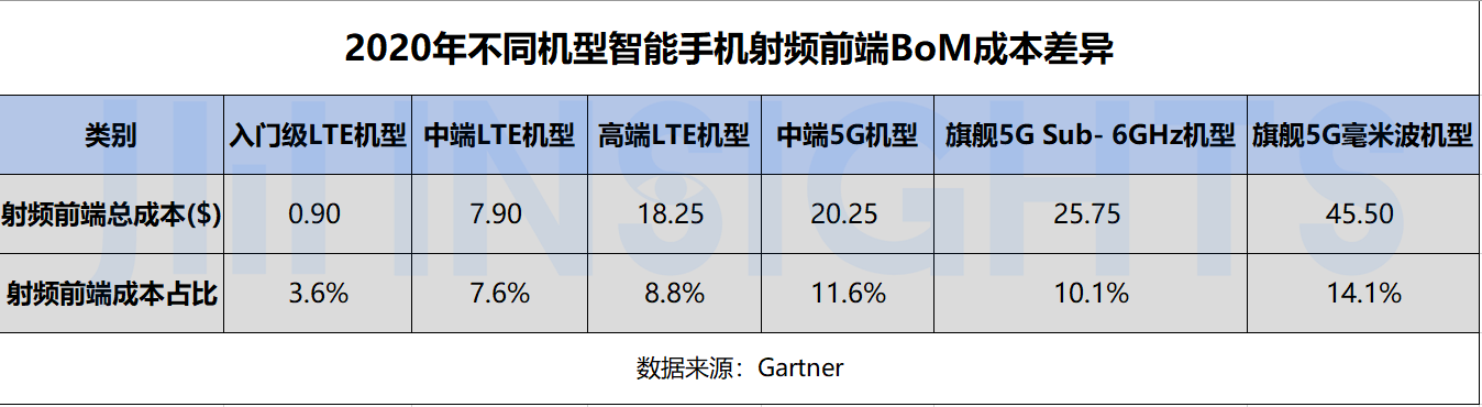 在射频前端层面,5G 手机与 4G 版本相比,每个 5G 手机中的射频含量高出 5 美元至 8 美元,而毫米波版本则多出 10 美元。Gartner 对这一数据的预测更高,分别达到 8 美元和 20 美元。下图显示了 2020 年 4G 到 5G 不同制式智能手机中,单机射频前端 BoM 成本和 BoM 成本占比都急剧攀升。