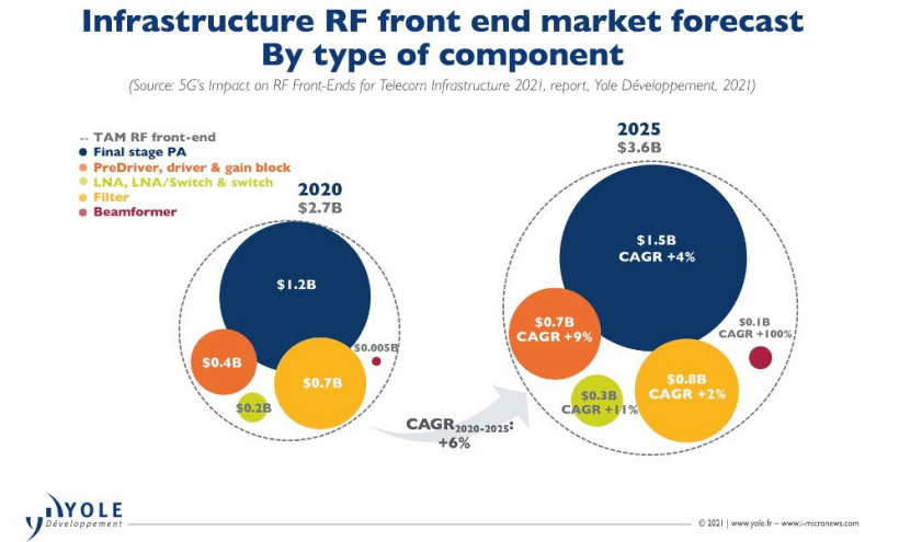 在这种趋势下,射频前端市场近几年一直保持着蓬勃发展的势头。Gartner 预测,到 2021 年底,射频前端市场规模预计将达到 170 亿美元,高于 2020 年的 140 亿美元,2019 年(5G 推出之年)至 2026 年间的复合年增长率为 8.3%,五年后射频前端市场规模将达到 210 亿美元。