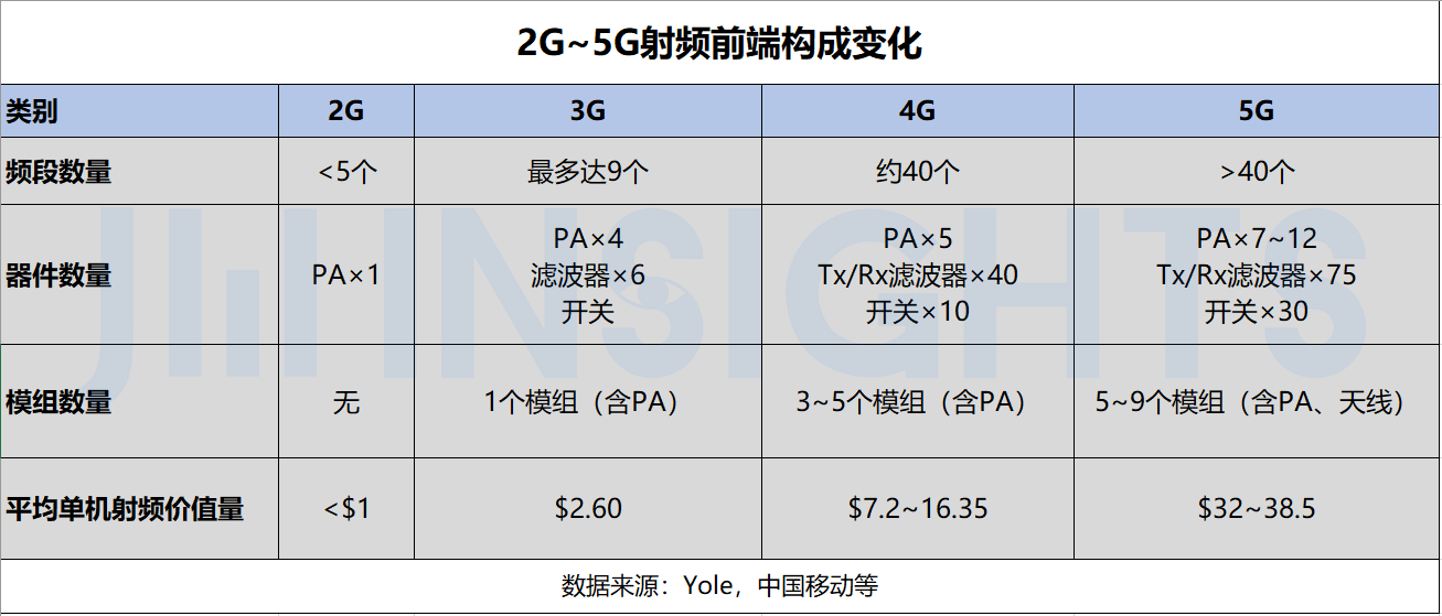 集微咨询认为,射频前端 BoM 成本在过去 10 年里保持稳步增长,主要由两个趋势推动,一是手机通信制式从针对地区和运营商的特定设计向“全球通”设计转变;二就是从 2G/3G 向 4G LTE 和 5G 过渡。射频前端模块中功率放大器(PA)、滤波器、天线、开关和低噪声放大器(LNA)等主要组件的用量增加,推动了单机价值量的增长。
