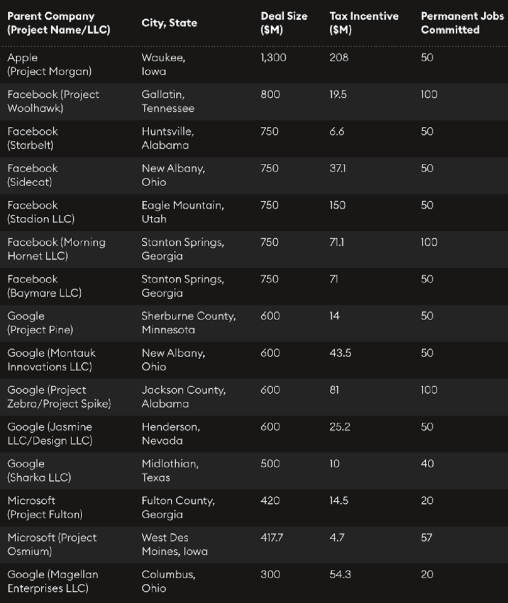 福布斯共找到了这些美国科技巨头旗下的 30 个美国数据中心项目的相关信息,并通过采访知情人士和审查相关文件、新闻报道,对从 2015 年以来启动的 15 个项目进行了解,以获得完整的税收减免、就业岗位和项目信息。