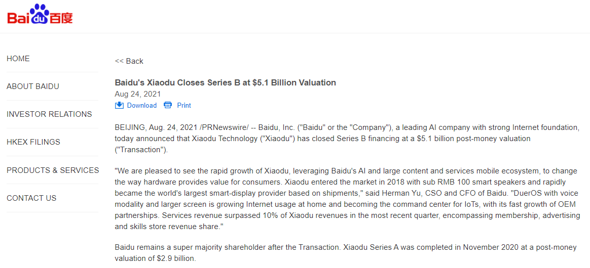 24 日消息 今日晚间,百度发布公告称,旗下小度科技已完成 B 轮融资,投后估值 51 亿美元(约 330.99 亿元人民币)。