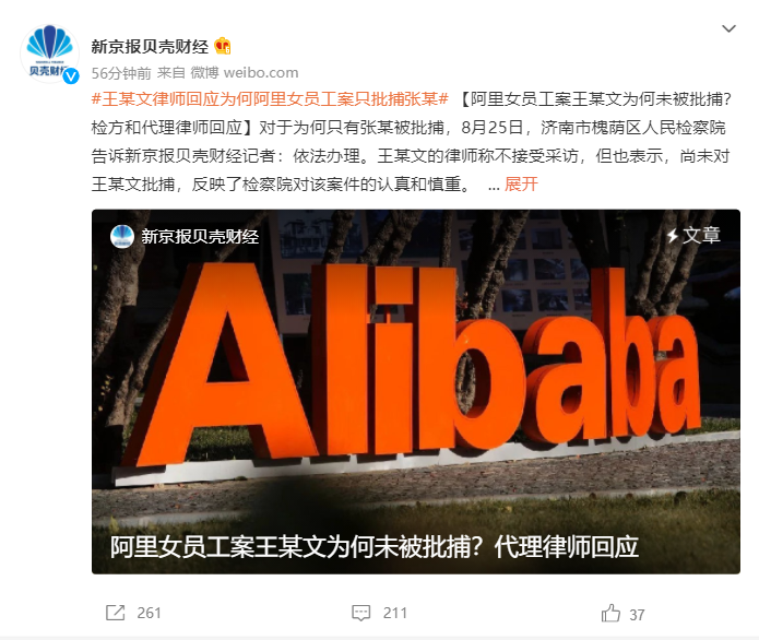 8 月 7 日,阿里巴巴一名女员工周某,发表长文描述了其被领导“曲一”(王某文)、济南当地客户张某性侵的过程。目前警方已经对两名犯罪嫌疑人进行立案调查。