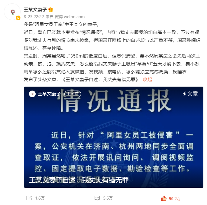 ,8 月 23 日,王某文妻子在互联网发表自述文章,表示周某言论与事实情况严重不符,周某事发当时存在主动勾引的情况,这篇长文存在诬陷、造假的嫌疑。