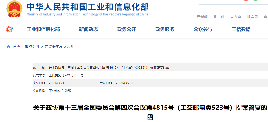 25 日消息 今日,工信部披露了《关于政协第十三届全国委员会第四次会议第 4815 号(工交邮电类 523 号)提案答复的函》。