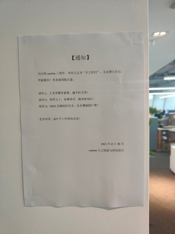 26 日消息 今日,数码博主 @C 科技 爆料称,realme 下发通知,为了庆祝成立三周年,将本周五(27 日)定为“不工作日”,全员禁止办公,带薪摸鱼!