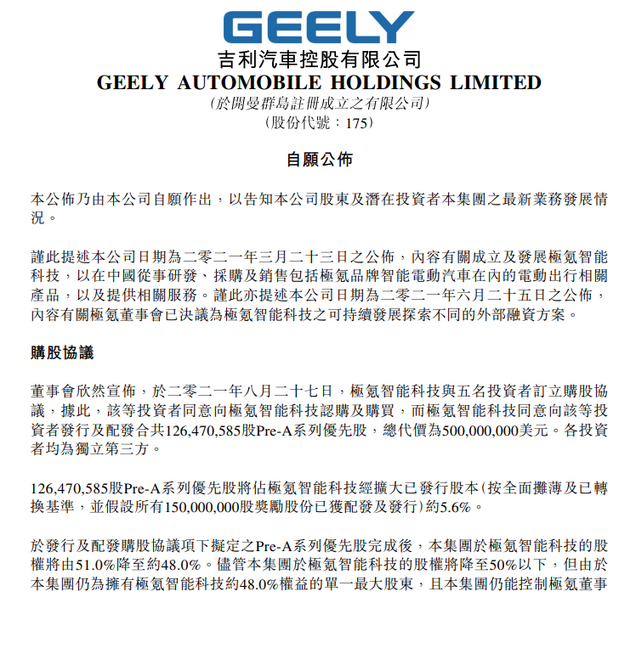 今年 3 月,吉利根据全球汽车产业变革及应用环境变化,形成两个蓝色吉利行动计划。根据官方介绍,蓝色行动计划一,将主攻智能化节能和小排量新能源汽车,包括混合动力、增程式插电混合动力。蓝色行动计划二,则主攻高端智能化纯电动汽车市场,由极氪智能科技公司正面参与,极氪汽车旗下首款猎装轿跑车型极氪 001 将于 10 月开始交付,吉利方面表示,极氪汽车首款车型极氪 001 预定超出预期,2021 年可交付定单此前已经售罄,未来除 2021 年的极氪 001 外,极氪目标每年至少发布两款新车。