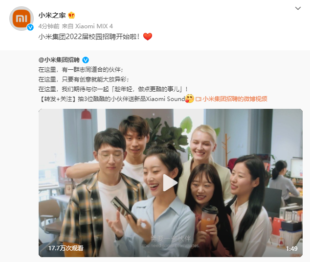 27 日消息 据小米集团招聘官方微博,小米集团 2022 年全球校园招聘活动在近日开启。