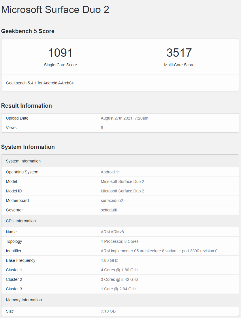Geekbench 信息显示,微软 Surface Duo 2 采用高通骁龙 888 处理器,配备 8GB 内存,搭载 Android 11 操作系统。