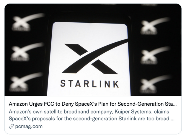 亚马逊敦促 FCC 拒绝 SpaceX 二代星链计划27 日报道,除了蓝色起源在登月合同等与 SpaceX 竞争外,贝索斯创办的亚马逊公司近日敦促美国联邦通信委员会(FCC)拒绝 SpaceX 公司的第二代星链计划,声称这违反了监管机构关于卫星部署的规定。亚马逊在抗议信中表示:“SpaceX 申请两种互斥配置的新颖方法与委员会的规则和公共政策都不一致,我们敦促委员会驳回这一修正案。”
