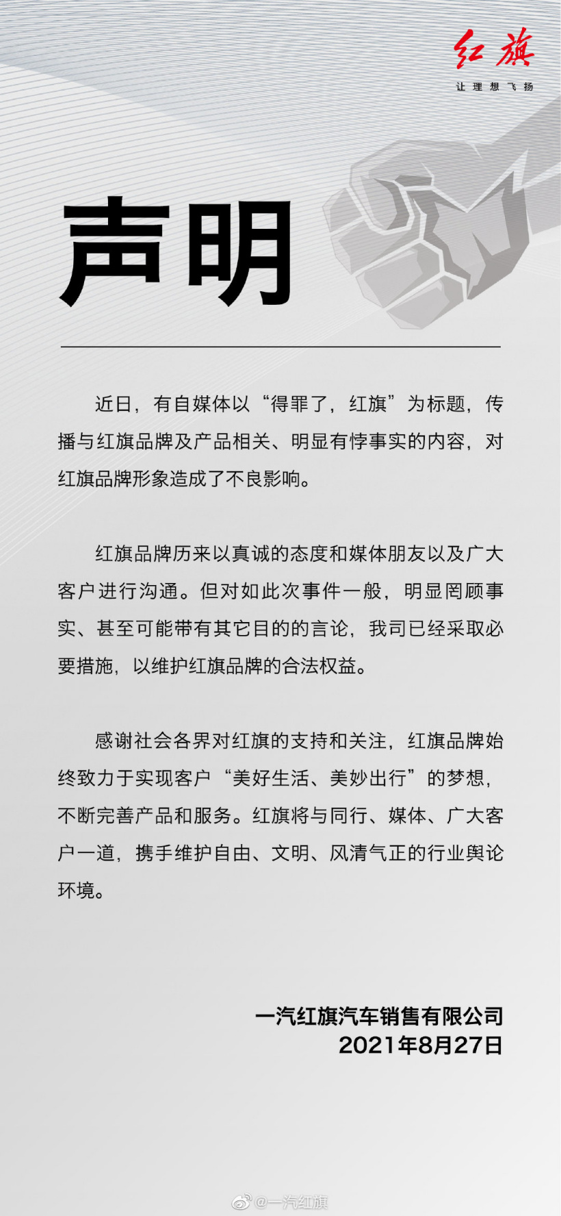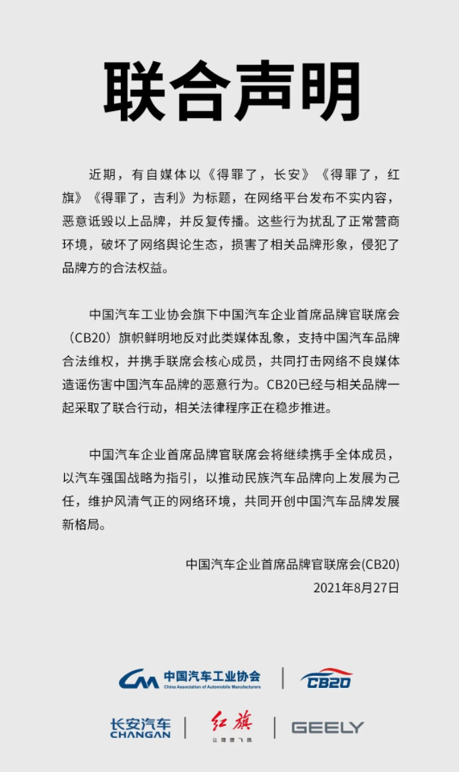 ,中国汽车企业首席品牌官联席会(CB20)表示,针对个别自媒体造谣诋毁中国汽车品牌,对品牌形象造成负面影响的恶意行为,中国汽车企业首席品牌官联席会(CB20)携手相关成员发起联合行动。CB20 及长安、红旗、吉利已经向该主体发送律师函,坚决推进相关法律程序。我们已取得平台方的支持,将全部侵权视频下架。