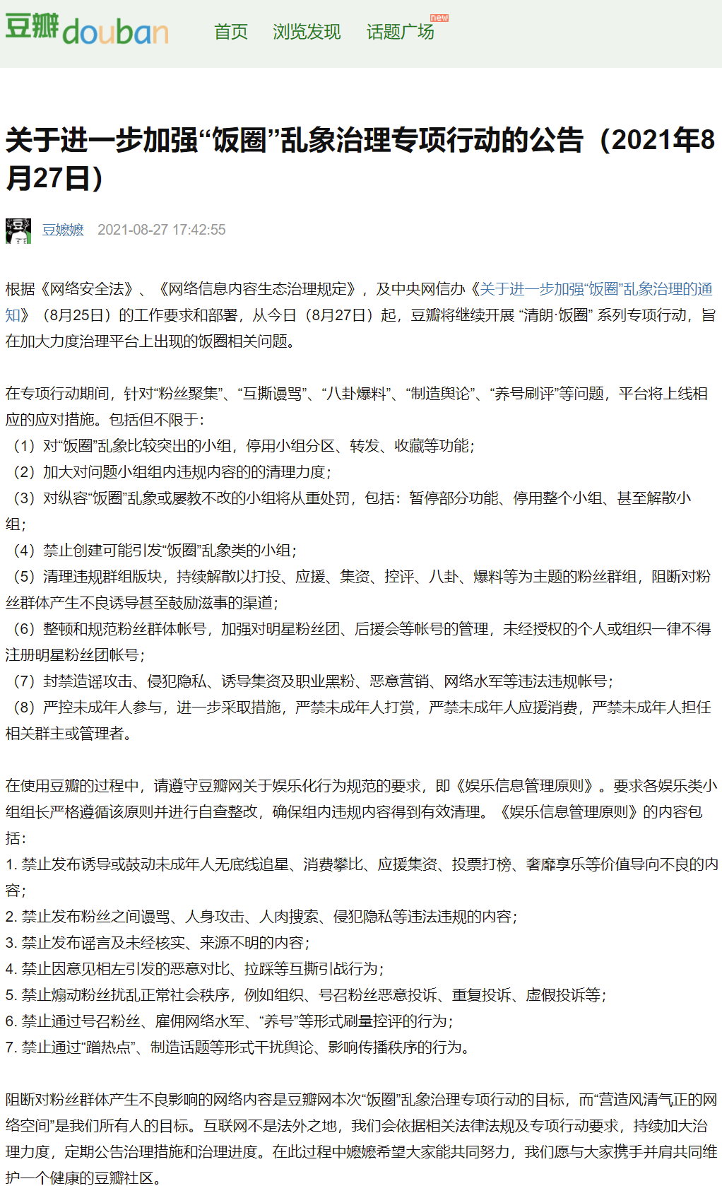 27 日消息 今日晚间,豆瓣官方发布了《关于进一步加强“饭圈”乱象治理专项行动的公告》。