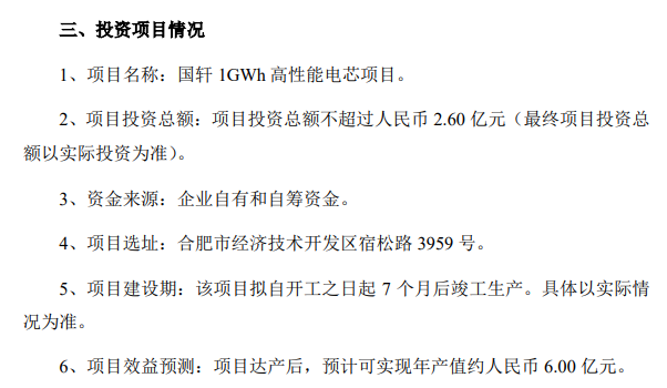 28 日消息 昨日,国轩高科发布公告称,公司全资子公司合肥国轩电池有限公司(以下简称“国轩电池”)拟以自有和自筹资金不超过人民币 2.60 亿元投资建设国轩 1GWh 高性能电芯项目。