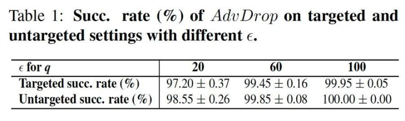 从成功率上来说,无论是在目标攻击还是无目标攻击的设定下,AdvDrop 有相当高的成功率来生成一个对抗样本。在目标攻击下,最高可以达到一个 99.95% 成功率。但相比于传统加噪的对抗攻击生成方式 (例如 PGD,BIM) 可以轻易达到 100% 的成功率来说,依然是强度较弱的。