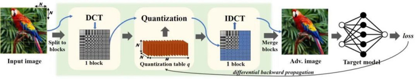 为了确定丢掉哪些区域的图片信息,并且保证扔掉的细节人们无法感知,他们提出一种通过优化量化表的方式来选择丢掉信息的区域以及丢掉的信息量的方法。此外,为了保证丢掉的细节对于人来说依然不可感知,要先将图像通过离散傅里叶变换从 RGB 转换到频域,再用量化表去量化一些频域的信息。频域操作相比于 RGB 的优点是,能更好的分离图像的细节信息(高频信息)和结构信息(低频信息),因此可以保证扔掉的细节对人来说不可感知。