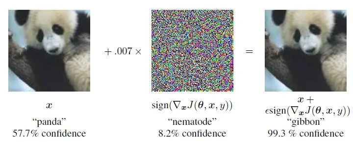 对抗样本一开始由 Szegedy 等人在 2013 年定义: 给定一张原始图片 x 及其标签 y,以及模型。对抗样本是指在原图 x 上加一些刻意制造的微小的扰动,从而让结果图像无法被正确识别(如下图所示)。通常来说,对抗扰动被限制在一定阈值内,从而保证结果图对人来说与原图几乎不可区分。后续有很多相关工作在当前设定下进一步探索了更多生成对抗样本的攻击方式,以及其他性质,例如迁移性等。