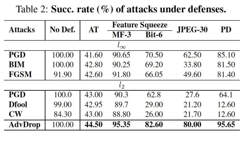他们也评估了 AdvDrop 在不同防御下的表现。目前主流防御方式主要分为两种,一种是对抗训练 ,另一种是基于去噪的防御方式。研究发现 AdvDrop 生成的对抗样本对于现阶段防御方式来说仍是一个挑战,尤其是基于去噪的防御方式。