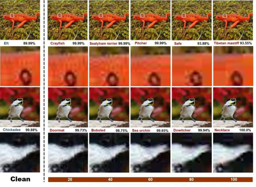 因此,传统对图片“加工”以骗过 AI 的方法是给图片加上“噪音”,相当于在当前图片上针对模型 "乱涂乱画",让 AI 无法识别,但原图片本身的关键信息没有丢失,只要用“橡皮擦”擦一擦,AI 依然能识别。如果反向操作,删除图片的关键信息,就像打“马赛克”,图片的关键信息已经丢失,那么 AI 无论如何也难以识别。这意味着,针对“打码攻击”,难以有防御措施。