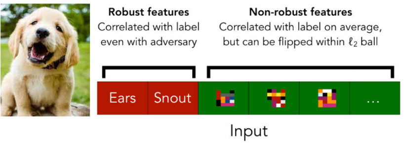 在对抗样本提出后,有各种各样的防御工作提出,其中对抗训练是最为有效的防御方式之一,但是对抗训练有非常明显的问题是:在稳健性(robustness)和准确率(accuracy)之间始终有一个平衡,即对抗训练提升模型稳健性的同时也导致的模型的准确率下降。为了解释这一现象,Ilyas 等人给对抗样本的存在提出了一个假设:对抗样本不是 bug,而是一组对人来说不可感知的特征。以人类感知为中心,人类所能察觉的特征就是 robust feature,其他的特征则是 non-robust。例如图 2 的狗狗,人类只会注意到其中的耳朵鼻子等显著特征 (robust feature)。