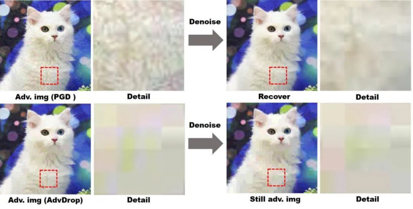 具体来说,在一定扰动阈值下,基于制造对抗扰动的对抗样本生成方式经过去噪后,图片有很大概率恢复成原始图片。但是对于用 AdvDrop 生成的 对抗样本来说,其本身就是由于部分特征丢失而导致的错误识别,而去噪操作甚至会加剧这种由于丢失而无法识别的问题。