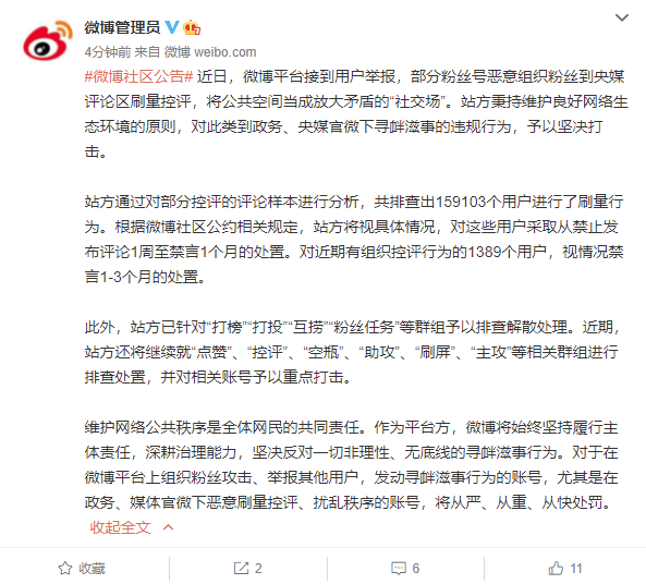 站方通过对部分控评的评论样本进行分析,共排查出 159103 个用户进行了刷量行为。根据微博社区公约相关规定,站方将视具体情况,对这些用户采取从禁止发布评论 1 周至禁言 1 个月的处置。对近期有组织控评行为的 1389 个用户,视情况禁言 1-3 个月的处置。
