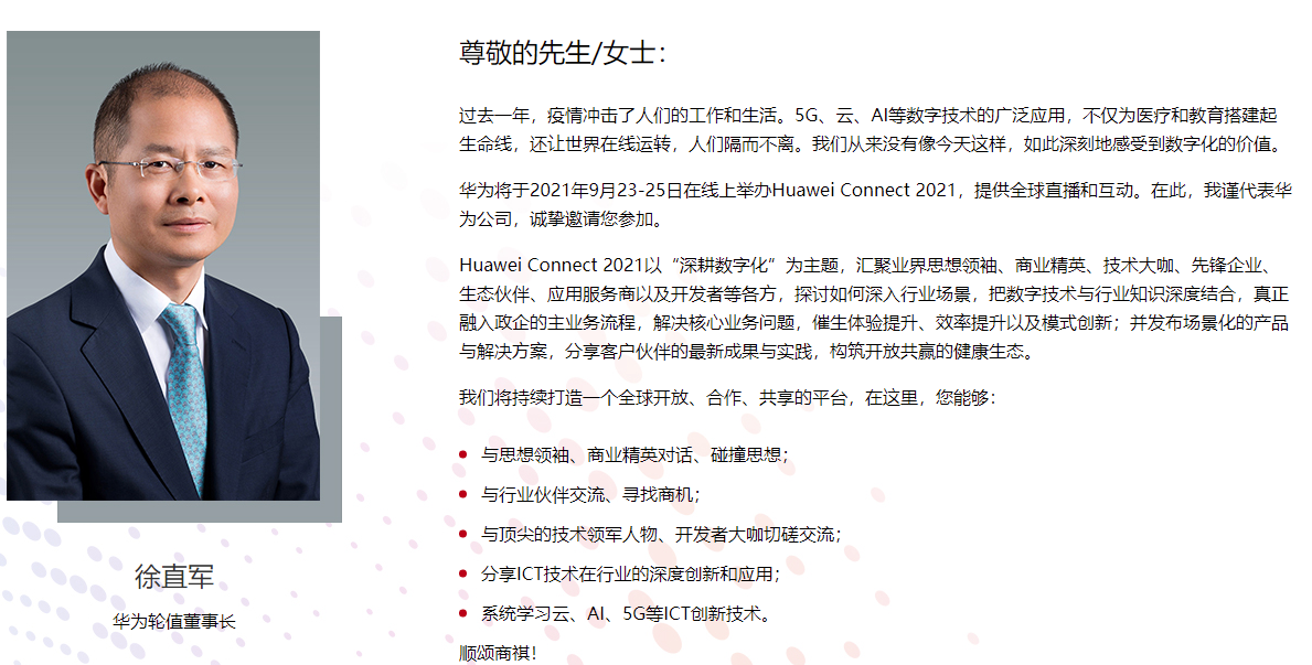 30 日消息 华为现已宣布,将于 2021 年 9 月 23-25 日在线上举办 Huawei Connect 2021 华为全联接大会,提供全球直播和互动,主题为“深耕数字化”。