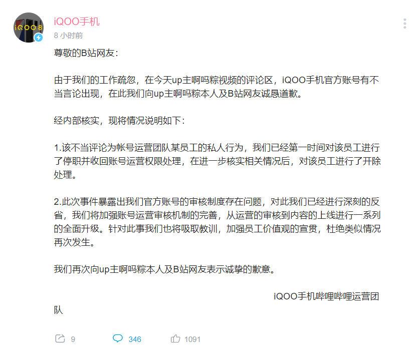 2.此次事件暴露出 iQOO 官方账号的审核制度存在问题,对此官方已经进行深刻的反省,将加强账号运营审核机制的完善,从运营的审核到内容的上线进行一系列的全面升级。针对此事官方也将吸取教训,加强员工价值观的宣贯,杜绝类似情况再次发生。