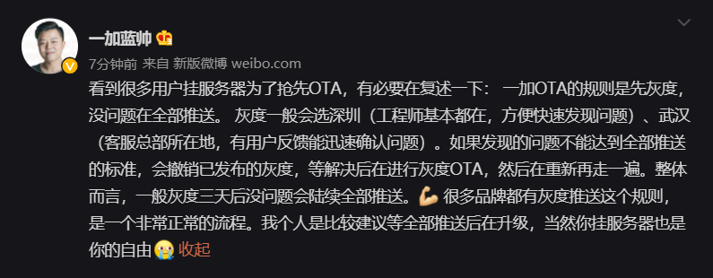 31 日消息 一加社区管理员蓝帅今日发布微博,解释了一加 OTA 升级的推送规则。