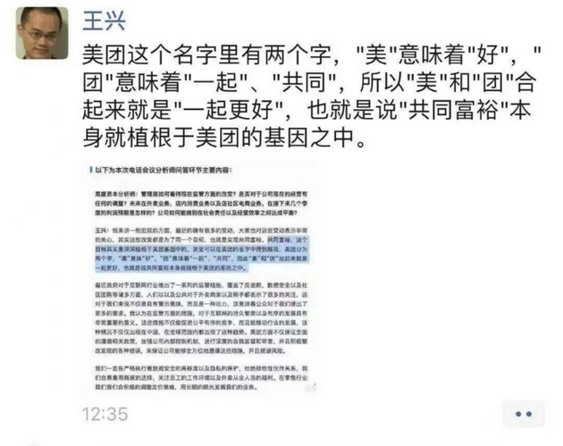 今日,王兴在朋友圈再次引用电话会议中的表述称,美团这个名字里有两个字,"美" 意味着 "好","团" 意味着 "一起"、"共同",所以 "美" 和 "团" 合起来就是 "一起更好",也就是说 "共同富裕" 本身就植根于美团的基因之中。