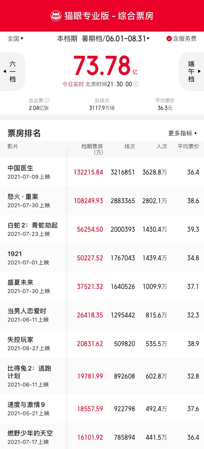 暑期档票房前三名为:《中国医生》、《怒火?重案》、《白蛇 2:青蛇劫起》。《中国医生》的票房为 13.22 亿,成今年票房最高的主旋律电影。《怒火?重案》票房 10.82 亿,创今年港片最高票房。《白蛇 2:青蛇劫起》票房 5.62 亿,为暑期档动画电影票房第一名。