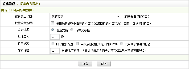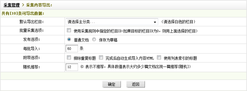 “批量采集选项”:如果在采集规则中已指定栏目ID,则可使用此功能,若指定的栏目ID为0,系统会把采集内容导入到“默认导出栏目”所选择的栏目中。