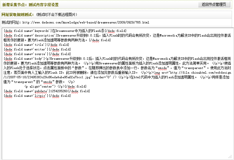 检查无误后,单击“保存配置并预览”。如果之前设置正确,单击后,将会进入“新增采集节点:测试内容字段设置”页面并看到相应的文章内容。如(图33)所示,