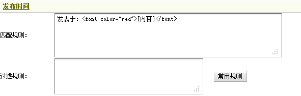 再次回到图23,找到“发表于:”及其后的“<font color=”red”>2009-09-29 14:21</font>”,与之前获取采集规则方法相同,此处应把“发表于: <font color=”red”>[内容]</font>”作为发布时间的采集规则。同样,这里也不需要使用过滤规则。填写后,如图27所示,
