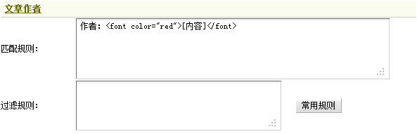 如上图23所示,在“作者:”二字后面有一组标签“<font color=”red”></font>”,以此猜测,作者名将会写在这组标签之间。同样,为了保持唯一性,这里应填写”作者:<font color=“red”>[内容]</font>“作为文章作者的采集规则。谨慎起见,请根据文章列表中其他文章内容页面查证此采集规则是否正确。这里不需要使用过滤规则。填写后,如图25所示,