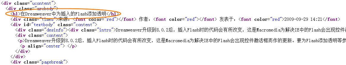 首先,打开“预览网址“的页面并单击右键,选择”查看源代码“,找到文章标题” 在Dreamweaver中为插入的Flash添加透明“,如(图23)所示,