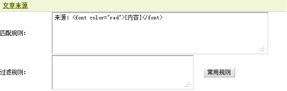 在上图23中,可发现“来源:”二字后面有一组标签“<font color=”red”></font>”,以此猜测,来源内容将会写在这组标签之间。与2.1.2处理方式相同,为了保持唯一性,文章来源的采集规则应为“来源:<font color=“red”>[内容]</font>“。同样,这里也不需要使用过滤规则。填写后,如图26所示,