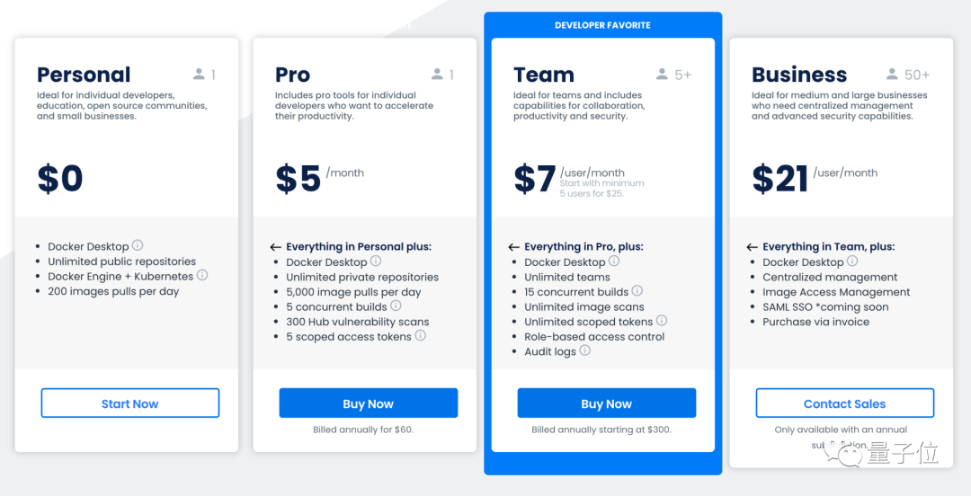 针对企业,Docker 给出了三种订阅方案:Pro、Team、Business。