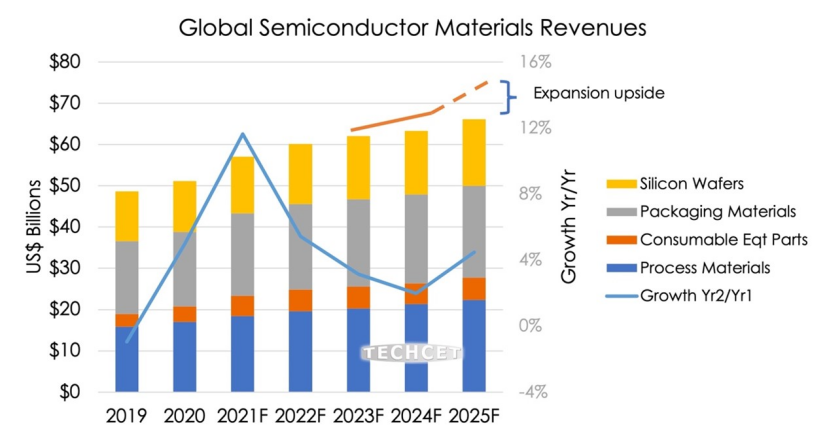 TECHET 8 月 30 日公布了一组数据,显示今年全球半导体材料市场将超过 570 亿美元。预计到 2025 年,所有半导体材料的复合年增长率都至少为 5.3%,增长最快的部分包括硅晶圆、清洗材料、CMP 材料和光刻胶。由于供需紧张可能会推高平均售价,预计硅晶圆和化学材料市场将得到额外提振,如下图: