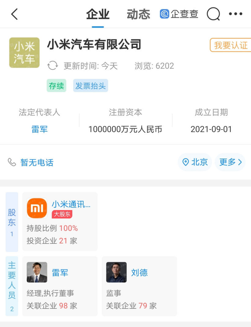 9 月 2 日消息 9 月 1 日,小米汽车正式完成工商注册,公司名为小米汽车有限公司,注册资金 100 亿元人民币,小米集团创始人、董事长兼 CEO 雷军出任法人代表。