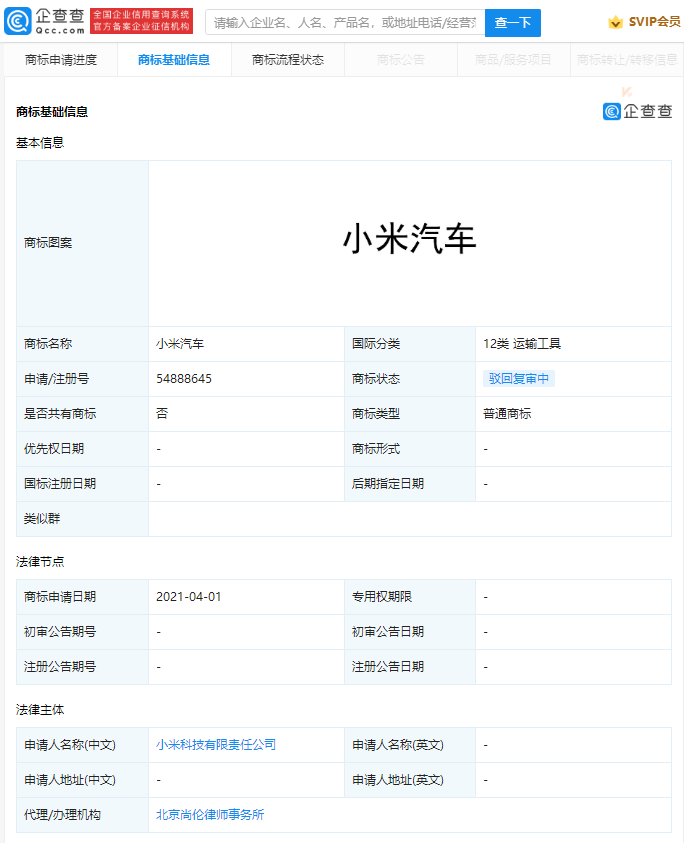 企查查 App 显示,近日,多个小米汽车商标状态变更为驳回复审中,商标国际分类涉运输工具、广告销售等。