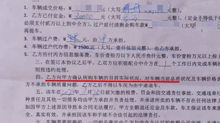 “涡轮增压先出了问题,送去修了之后,一检测全是问题。气囊是换过的、冷却液泄露、雷达也失效了。”这时候栋栋才想起了当时的买车合同,拿出来一看却发现其中的大有玄机,“从条款上我就没有什么可以商量的余地,我也是那时候才发现,这是一份中介合同。”