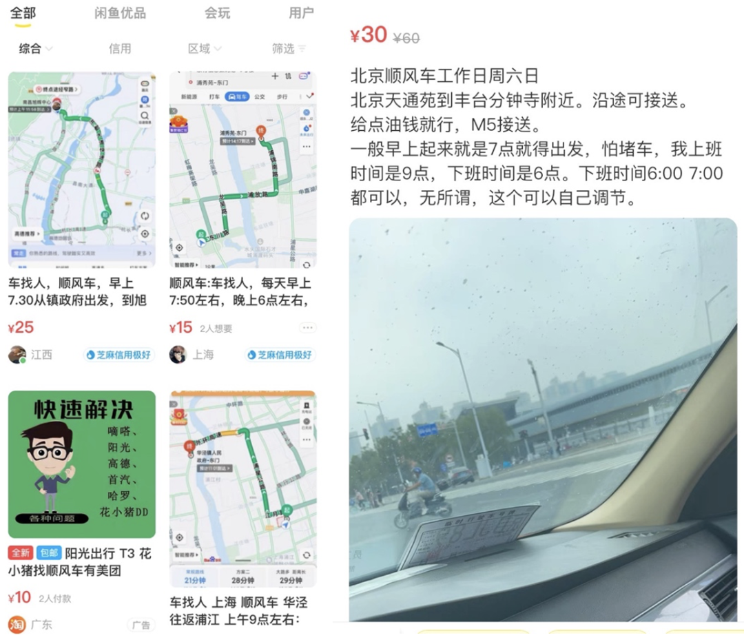 如果说宠物交易并不算是闲鱼“出圈”的典型生意,那“顺风车”作为其平台的衍生品,应该更具代表性。