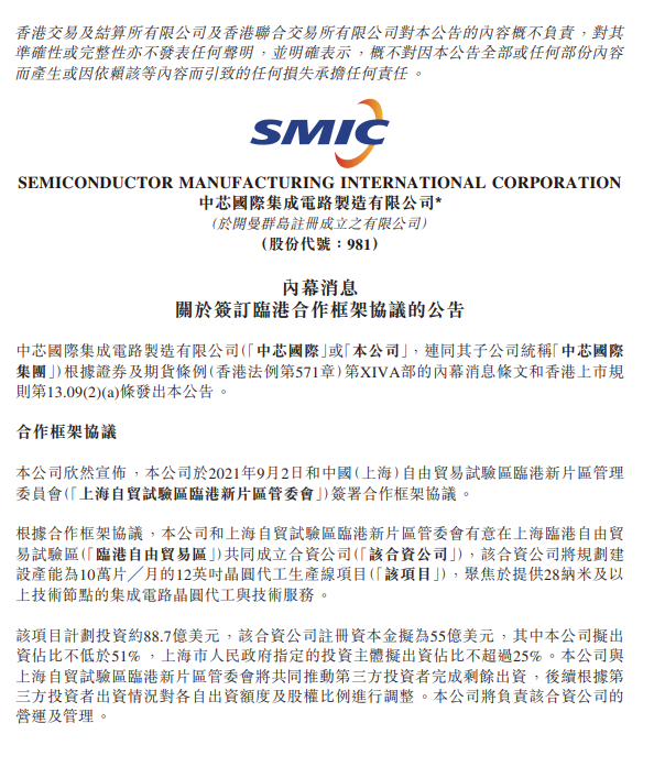 3 日消息 今日中午,中芯国际发布公告称,公司于 9 月 2 日和中国(上海)自由贸易试验区临港新片区管理委员会签署合作框架协议。