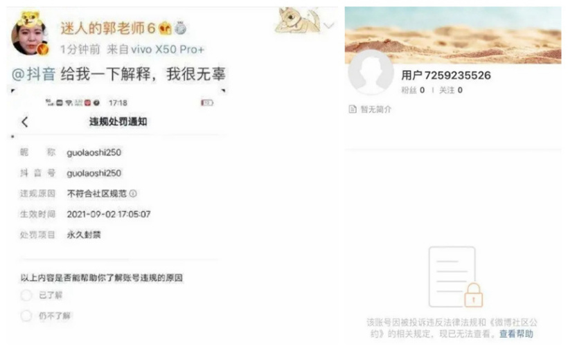 4 日消息 9 月 2 日,在被抖音永久封禁后 @迷人的郭老师 6 在微博发文要求抖音解释永久封禁的违规处罚,并晒出被抖音永久封禁截图,截图显示其被封禁的原因是不符合社区规范。随后,网友发现“郭老师”的微博账号也被封禁了。