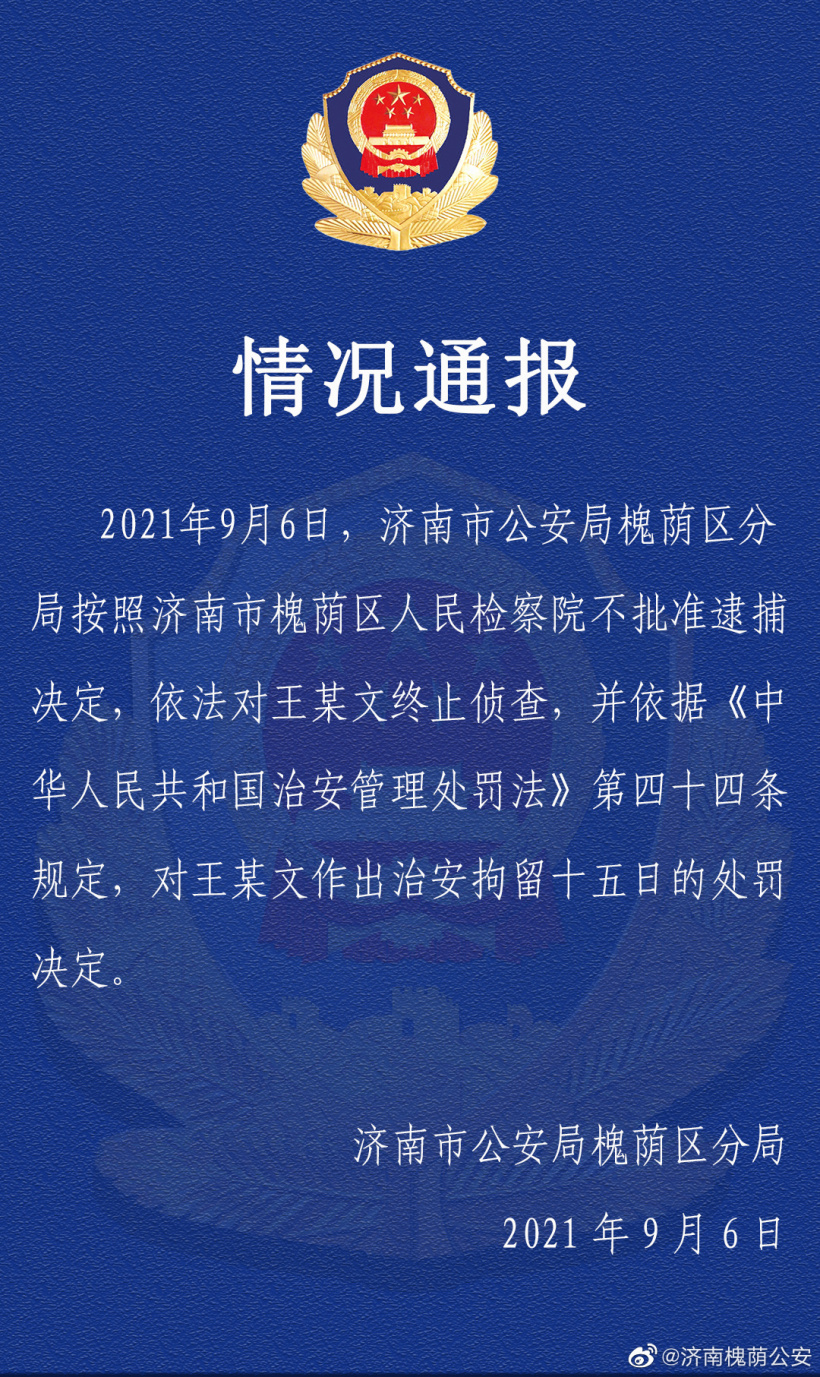 随后,济南市公安局槐荫分局发布情况通报,表示按照济南市槐荫区人民检察院不批准逮捕的决定,依法对王某文终止侦查,并依据《中华人民共和国治安管理处罚法》第四十四条规定,对王某文作出治安拘留十五日的处罚决定。