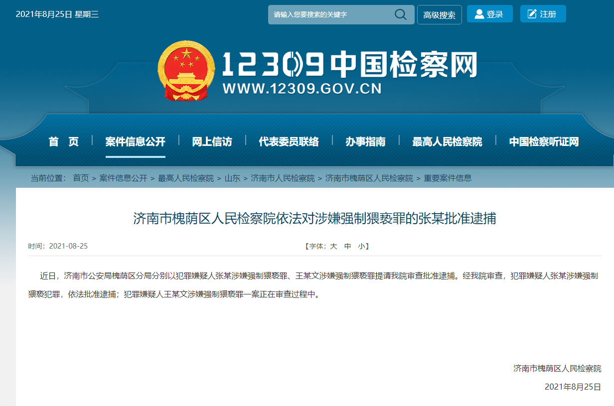 阿里巴巴女员工被侵害案另一名涉事人员张某,涉嫌强制猥亵罪。8 月 25 日,济南市槐荫区人民检察院依法对其批准逮捕。