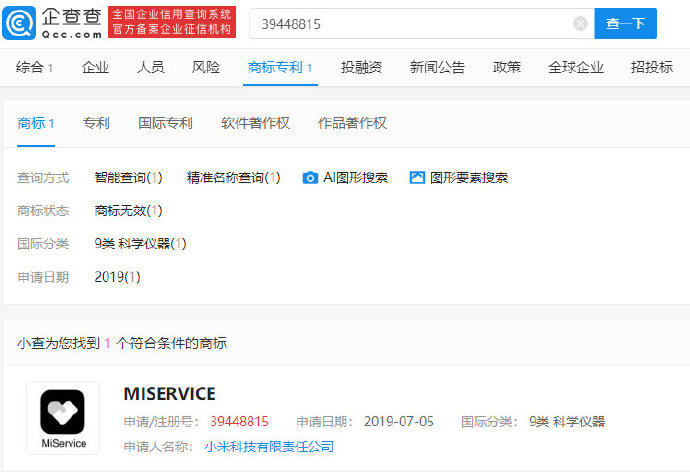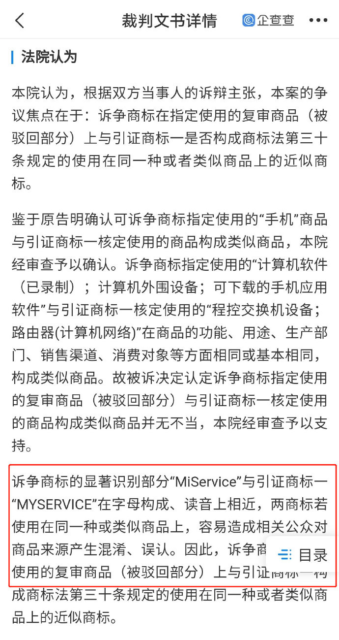 企查查 App 显示,法院查明该案诉争商标为小米公司“MiService 及图”,小米公司诉称该商标与华为公司 MyService 商标未构成近似且核定使用的商品不构成类似商品。