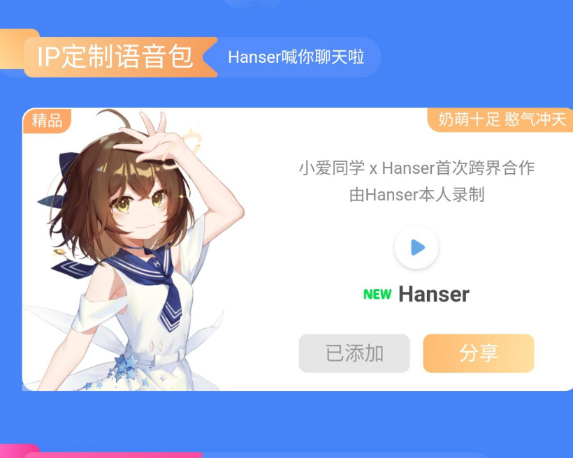 小米小爱同学近日上线了一款 Hanser 定制语音包,后者为虚拟主播。