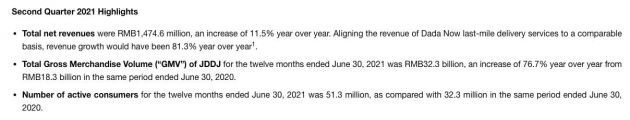 2021 年第二季度,达达集团旗下本地即时配送平台达达快送营收 6 亿元人民币。截至 2021 年 6 月 30 日的 12 个月内,京东到家平台总交易额(GMV)为 323 亿人民币,同比增长 77%;年活跃消费者 5130 万,同比增长约 60%,单季净增创新高。