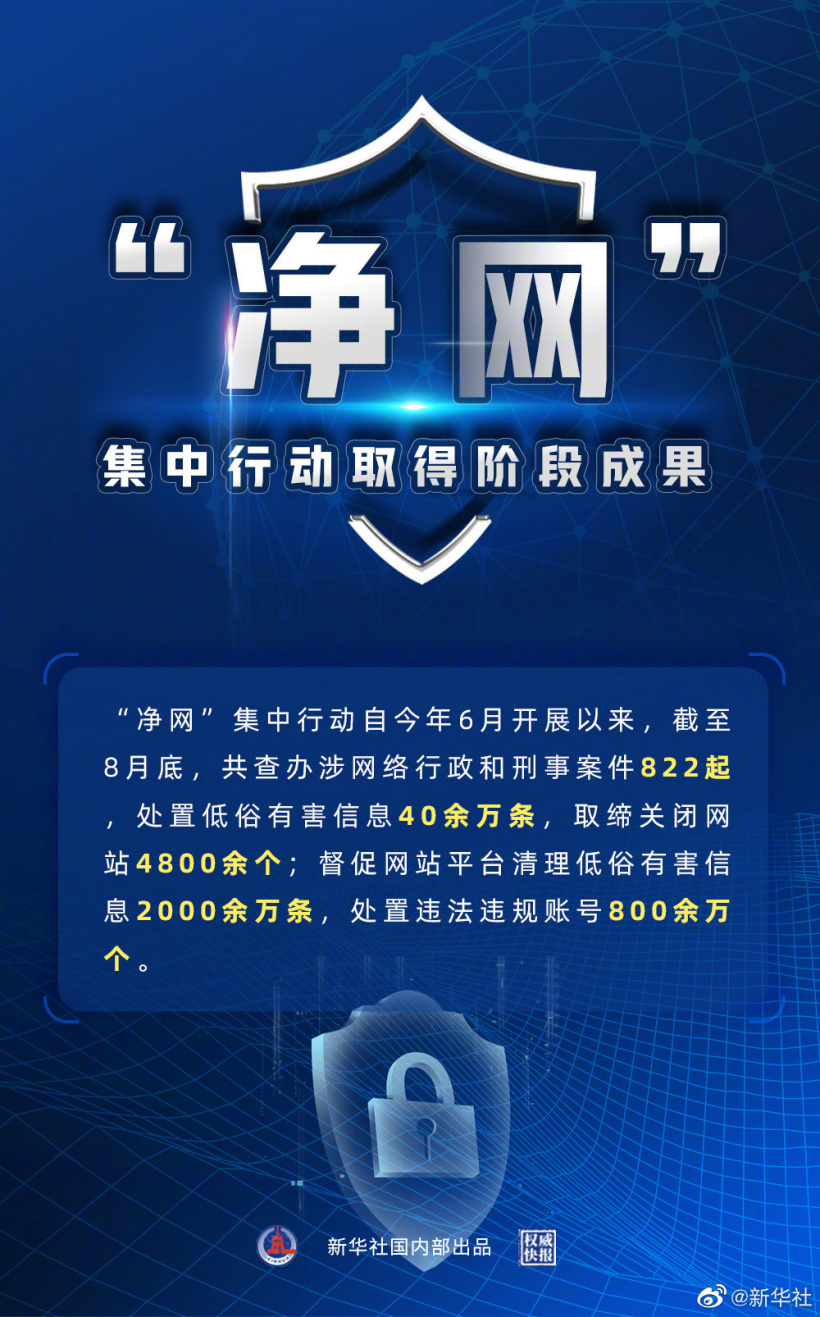 据介绍:截至今年 8 月底,此次行动共查办涉网络行政和刑事案件 822 起,处置低俗有害信息 40 余万条,取缔关闭网站 4800 余个;督促网站平台清理低俗有害信息 2000 余万条,处置违法违规账号 800 余万个。