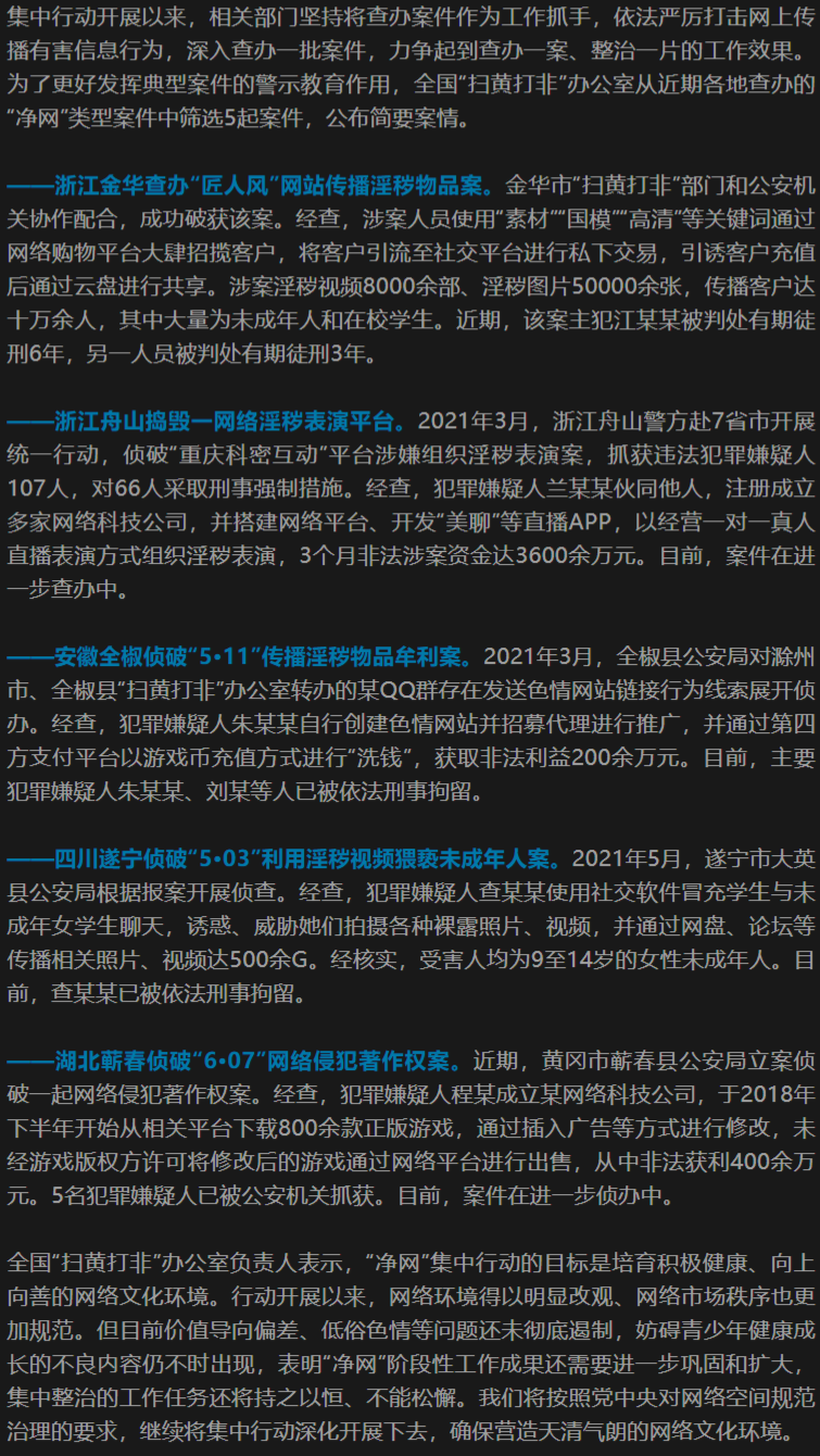 7 日消息 据央视和新华社等报道,按照全国“扫黄打非”工作小组部署,中央宣传部、中央网信办、工业和信息化部、公安部、文化和旅游部、国家广播电视总局今年 6 月起共同开展“净网”集中行动,目前取得阶段成效。